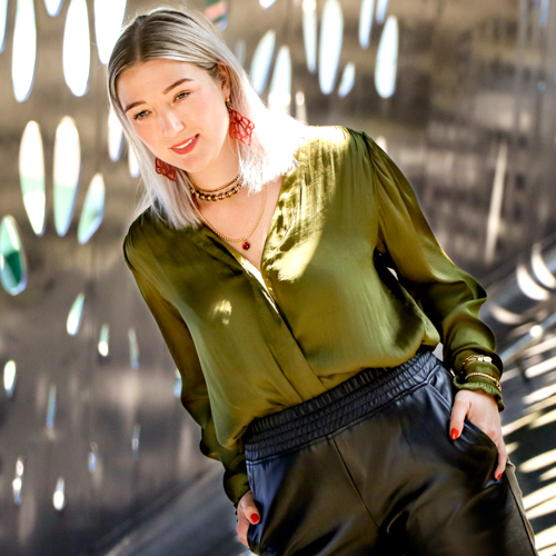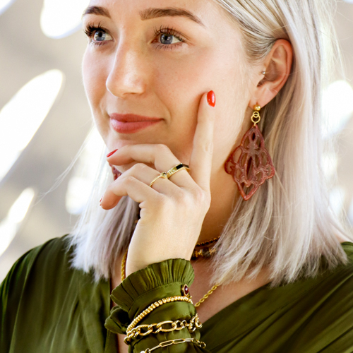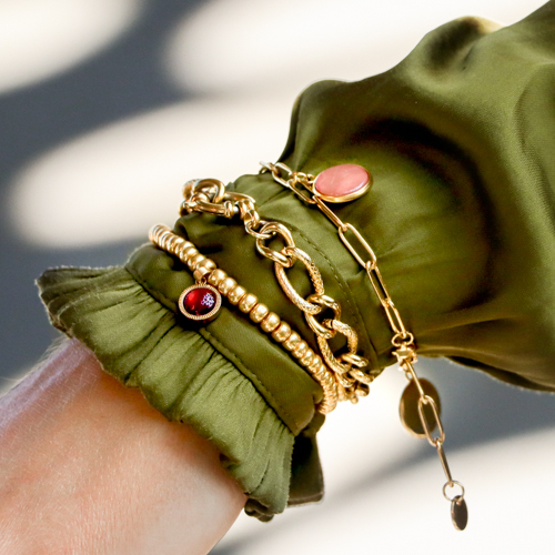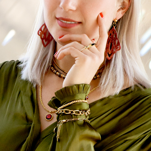 La tendencia del poder de la sensualidad es muy apasionada y femenina, con verdaderas declaraciones de estilo. Pensemos, por ejemplo, en el uso de colgantes de resina, cuentas de cerámica, gargantillas o bien conocidos como chokers y pulseras que se llevan sobre las mangas. Los anillos grandes también se adaptan perfectamente a esta tendencia.