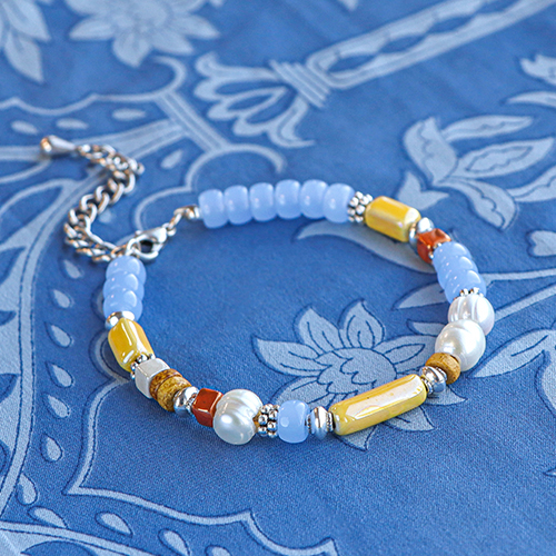¿Qué puede ser más divertido para tus clientes que una bonita colección de pulseras que todo el mundo pueda llevar? Diseña pulseras con abalorios de cerámica que alternas con, por ejemplo, perlas de agua dulce, cuentas Katsuki o un precioso abalorio metálico DQ. Cuando coloques un cierre, asegúrate de utilizar una cadena de extensión o de hacer un cierre con un nudo corredizo, por ejemplo, para poder ajustar la longitud de la pulsera.