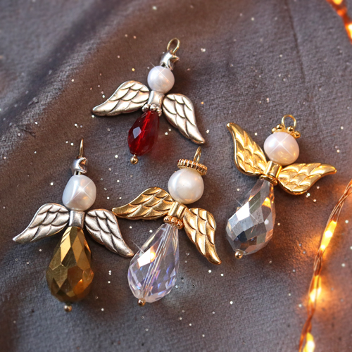 Hacer ángeles de la suerte con componentes de joyería puede parecer difícil, ¡pero no lo es! Estamos encantados de ayudarte, mostrarte lo que necesitas y qué angelitos puedes hacer. Los materiales necesarios para hacer los angelitos: bastones metálicos, abalorios Polaris Elements o cuentas facetadas gota, alas de ángel metálicas DQ, perlas de agua dulce o abalorios facetados Strass rondeles o entrepiezas metálicas DQ, un alicate cortador y un alicate de punta redonda. Para empezar, enhebra una cuenta facetada en forma de gota en un bastón metálico y luego agrega los otros artículos en el orden que prefiera. Para la cabeza puedes usar perlas de agua dulce o cuentas facetadas, pero por supuesto pueden ser otras también. Cuando hayas terminado de enfilar, corta el bastón aproximadamente un centímetro por encima de la última cuenta. Dóblalo con los alicates de punta redonda para crear un ojal. Y eso es todo, ¡buena suerte!