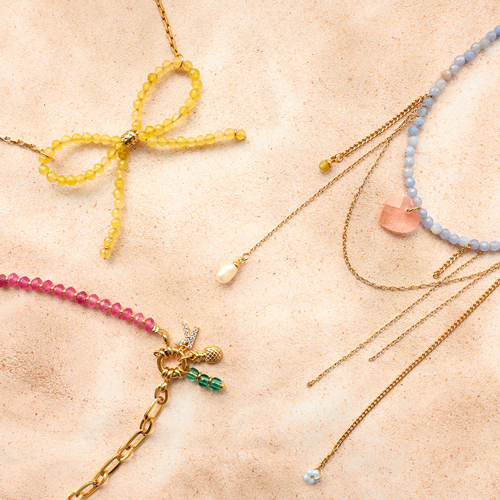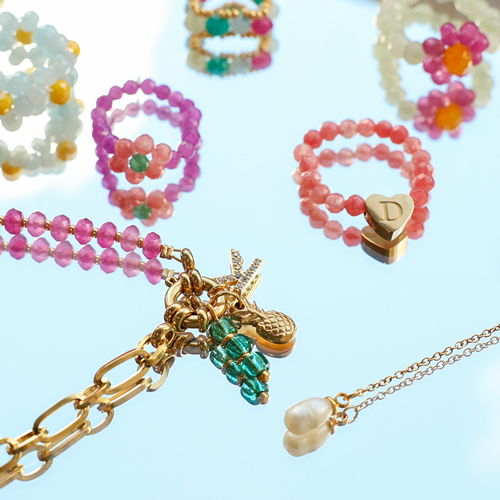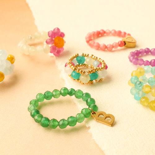 Esta nueva colección de piedras naturales ofrece una hermosa variedad de colores. Las cuentas están incorporadas en anillos y collares con patrones florales y formas de lazo. Combina hilo elástico, cuentas miyuki, perlas y dijes de iniciales para anillos divertidos, o crea collares elegantes con cadena jasseron, colgantes de acero inoxidable, iniciales y capas de cadenas jasseron.