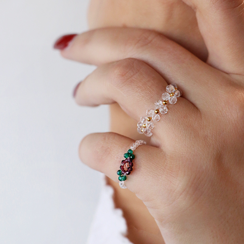 Con estas pequeñas piedras naturales faceteadas y el alambre elástico es posible hacer bonitos anillos que se pueden llevar junto con los anillos ya listos para llevar de la colección. Enfila las piedras naturales faceteadas de imitación en un hilo elástico y altérnelas con cuentas de acero inoxidable dorado. Crea pequeñas flores de las piedras naturales faceteadas con un abalorio dorado como corazón. Forma las cerezas enfilando primero las piedras naturales faceteadas blancas, luego 1 verde y 2 rojas, y luego vuelve a enhebrar la cuenta verde. ¡Son muy divertidas de hacer y de llevar!