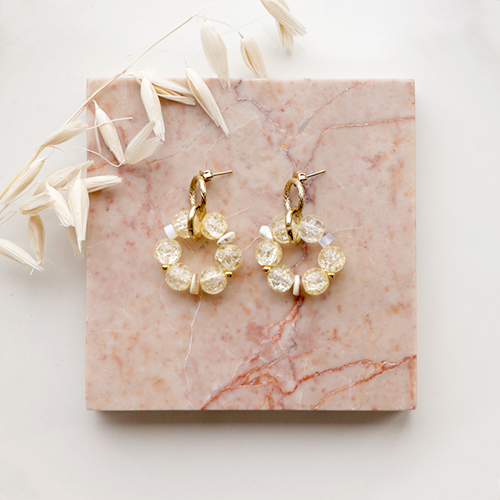 Para diseñar unos lindos pendientes con estos abalorios de cristal, puedes utilizar como punto de partida unos pendientes base o pendientes criollas/aro. Enfila las cuentas de cristal en las criollas/aros grandes y, para conseguir un bonito efecto, altérnalas con unas pequeñas chafas de acero inoxidable doradas. Puedes hacer pulseras combinando los abalorios de cristal con piedras naturales y conchas. Utiliza hilo de macramé de color dorado o una cadena jasseron gruesa y termina con un bonito cierre de reasa marinera.