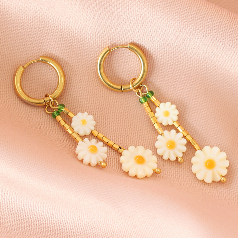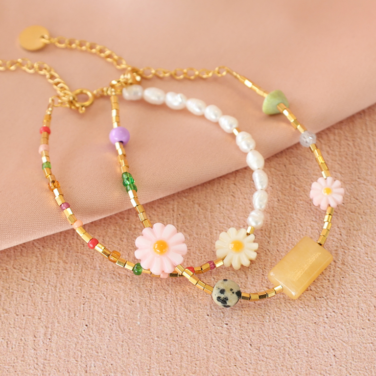 Crea un look veraniego con las cuentas de concha en forma de flor. Crea un bonito set compuesto por pulseras y pendientes. Enfila las cuentas en forma de flor en un bastón con bola en combinación con jasseron, una mezcla de abalorios y un ¡lindo pendiente criolla!