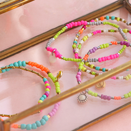 ¡Esta serie de abalorios de cristal rocallas es muy popular debido a los bonitos colores neón que están de súper moda este verano! Con hilo elástico y pegamento para joyería, puedes confeccionar preciosas pulseras. Para esto, usa las cuentas rocalla de diferentes tamaños y combínalas con abalorios hematita para conseguir un collar muy original. Para el cordón de las gafas de sol, puedes utilizar el maravilloso hilo de macramé. Enfila las cuentas en un hilo y, a continuación, enrosca varios hilos entre sí hasta alcanzar la longitud deseada.