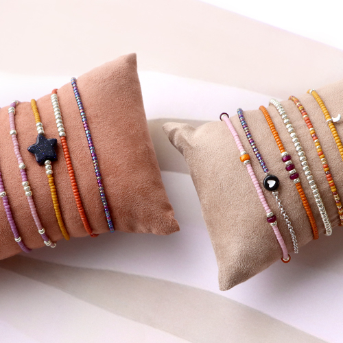 ¿Buscas inspiración para tu colección de pulseras para la próxima temporada? Estos abalorios rocalla Miyuki en tonos cálidos serán muy útiles. Puedes utilizar alambre metálico y cerrar la pulsera con un bonito cierre o utilizar un hilo elástico. Alterna los abalorios con cuentas doradas y plateadas o coloca un bonito colgante en tu creación. Si utilizas un cierre, te recomendamos que utilices una cadena de extensión para asegurarte de que puedes ajustar la pulsera a la medida correcta. Otro consejo para trabajar con estas cuentas pequeñas: utiliza un tapete de abalorios para evitar que se caigan.