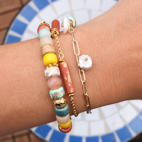 Si te gustan las joyas hechas de materiales naturales en colores de tendencia, entonces esta colección de abalorios de cerámica DQ Griegos gold spot es perfecta para ti. Las cuentas de tubo y redondas pueden combinarse fácilmente entre sí, pero también forman la base de hermosas joyas con otros componentes naturales. El agujero grande de las cuentas rondel permite ensartarlos en una preciosa cadena Jasseron. Es posible hacer que el agujero sea visualmente más pequeño enroscando un terminal en cada lado del cordón. Para dar un efecto elegante, solo crea un collar con perlas de agua dulce y coloca una cuenta tubo en el centro. El cierre puede ir con o sin cadena de extensión y el collar ¡está listo! Haz pulseras y pendientes de moda combinando los abalorios de cerámica con los de vidrio, perlas de agua dulce y cuentas de metal DQ. También utiliza bastones metálicos y alicates de punta redonda para crear originales pendientes.
