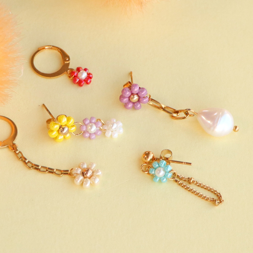 Esta serie de abalorios Miyuki flor es perfecta para crear pendientes, entre otras cosas. Puedes pegar las flores en la fornitura pendiente base y también colgar algunas flores en la parte inferior del mismo. El ojal encaja fácilmente a través de una de las cuentas, lo que hace que el colgante sea fácil de hacer. Cuando uses las flores para chulear tu ropa, es útil pegarlas con una gota de pegamento para que no se muevan. A continuación, cóselos con unas puntadas.