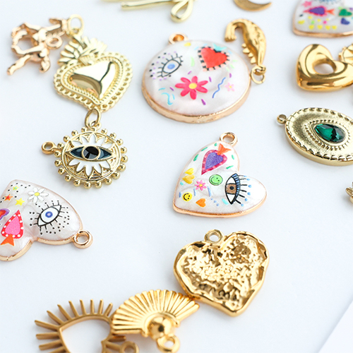 ¡Esta nueva colección de colgantes metálicos funky con esmalte en color dorado es un verdadero atractivo! Combina los colgantes con cadena jasseron y diferentes dijes para un collar único y divertido. ¡Mezcla, combina y crea tu propia colección funky de primavera!