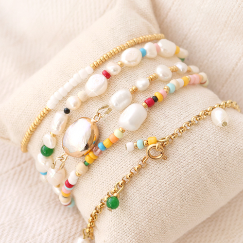 ¡Las perlas se han coronado nuevamente como las reinas de la temporada! Especialmente para nuestra inspiración de verano hemos creado variedad de pulseras donde combinamos diversos artículos de nuestro surtido. Para hacer las pulseras hemos enfilado en un hilo elástico un mix de perlas, abalorios rocalla (Miyuki), cuentas de coco, piedras naturales, abalorios chips y cuentas faceteadas. Te recomendamos usar los mismo colores en las diferentes pulseras para crear un bonito juego. Otra opción es crear un lindo accesorio como un cordón para gafas. Solo tienes que enfilar en un alambre las perlas nugget combinando con la rocalla Miyuki, cadena jasseron y sujeta los extremos de la cadena con una goma ajustable para gafas. ¡Fuertes vibras de verano!