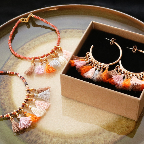 ¡Este otoño, tus accesorios se visten de un fantástico colorido con la nueva colección de borlas mini! Esto es una gran fuente de inspiración para crear bisutería con vibras otoñales como estas preciosas pulseras y pendientes. Las pulseras son súper sencillas de hacer solo necesitas enfilar las rocallas Miyuki en un hilo metálico y cerrar con un práctico mosquetón. Para los pendientes elegimos una criolla con anillas donde colgamos las borlas y ¡listo!. ¡La creación de joyería nunca fue tan fácil!