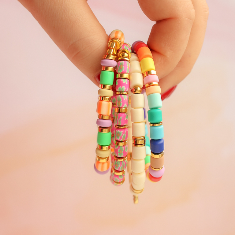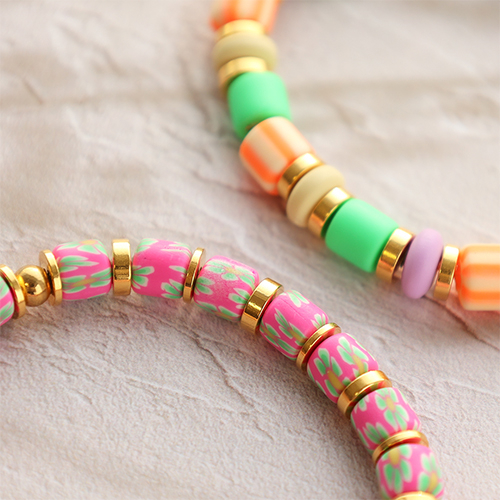 Esta serie de abalorios de polímero se puede incorporar perfectamente a una divertida colección de pulseras confeccionadas con hilo elástico. Alterna las cuentas de polímero con los abalorios metálicos DQ rondeles disco para dar un look más chic. Por último, no olvides reforzar el nudo que se utiliza para cerrar la pulsera con una gota de pegamento para bisutería. Combina las pulseras de polímero con pulseras de cadena jasseron y pulseras brazalete.